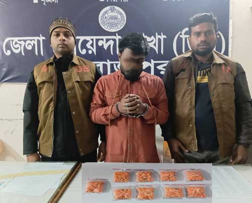 পিরোজপুর অফিস : পিরোজপুর জেলা গোয়েন্দা শাখা (ডিবি) বিশেষ অভিযানে ৯০০ পিস ইয়াবাসহ রিয়াজ শেখ (৩১) নামের এক মাদক কারবারিকে আটক করেছে। বৃহস্পতিবার (৭ ডিসেম্বর) রাত সাড়ে ১০ টার দিকে পৌরসভার ৮নং ওয়ার্ডের যমুনা ফিলিং স্টেশনের পশ্চিম পাশে বরিশাল-খুলনা আঞ্চলিক মহাসড়কে এ অভিযান চালানো হয়। ডিবি সূত্র জানায়, পুলিশ সুপার মোহাম্মদ মনজুর আহমেদ সিদ্দিকীর নির্দেশনায় ও অতিরিক্ত পুলিশ সুপার (ক্রাইম অ্যান্ড অপস্) মো. জিয়াউর রহমানের তত্ত্বাবধানে এসআই (নি.) মো. আতিকুর রহমানের নেতৃত্বে ডিবির একটি দল এ অভিযান পরিচালনা করে। পুলিশের উপস্থিতি টের পেয়ে পালানোর চেষ্টা করলে রিয়াজকে আটক করা হয়। পরে তার প্যান্টের ডান পকেট থেকে নীল পলিথিনে মোড়ানো ৯টি জিপার প্যাকেটে মোট ৯০০ পিস ইয়াবা উদ্ধার করা হয়। এর বাজারমূল্য প্রায় ৩ লাখ ৬০ হাজার টাকা। ঘটনার পর পিরোজপুর থানায় নিয়মিত মামলা (নং–৩, তারিখ ০৮/১২/২০২৫) রুজু করা হয়েছে। জেলা পুলিশ জানায়, মাদক নির্মূলে তারা জিরো টলারেন্স নীতি অনুসরণ করে কঠোর পদক্ষেপ অব্যাহত রেখেছে।