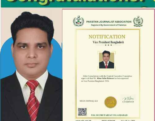 বিশেষ প্রতিনিধি : বিশ্বের বিভিন্ন দেশের পেশাদার সাংবাদিকদের সমন্বয়ে গঠিত আন্তর্জাতিক সংগঠন Pakistan Journalist Association (PJA)–এর কেন্দ্রীয় কমিটির সদস্য এবং বাংলাদেশ শাখার সহ-সভাপতি হিসেবে নির্বাচিত হয়েছেন Bangladesh Central Press Club (B.C.P.C)–এর প্রতিষ্ঠাতা সভাপতি ও জাতীয় দৈনিক মাতৃজগত পত্রিকার সম্পাদক খান সেলিম রহমান।আন্তর্জাতিক অঙ্গনে সাংবাদিকতার ক্ষেত্রে তাঁর এই গুরুত্বপূর্ণ অর্জনকে গণমাধ্যম সংশ্লিষ্টরা একটি ইতিবাচক ও সম্মানজনক মাইলফলক হিসেবে দেখছেন। সাংবাদিকতা পেশায় দীর্ঘদিনের অভিজ্ঞতা, সংগঠক হিসেবে দক্ষতা এবং নিরপেক্ষ ও বস্তুনিষ্ঠ সাংবাদিকতার প্রতি তাঁর অবিচল অবস্থানের স্বীকৃতিস্বরূপ এই দায়িত্ব প্রদান করা হয়েছে বলে মনে করছেন সংশ্লিষ্ট মহল।সোমবার (৫ জানুয়ারি) পাকিস্তান জার্নালিস্ট অ্যাসোসিয়েশনের অফিসিয়াল ফেসবুক পেজ ও এক প্রেস বিজ্ঞপ্তির মাধ্যমে খান সেলিম রহমানকে আনুষ্ঠানিকভাবে অভিনন্দন জানানো হয়। বিজ্ঞপ্তিতে তাঁর পেশাগত অবদান, নেতৃত্বের গুণাবলি এবং আন্তর্জাতিক সাংবাদিকতার ক্ষেত্রে ভূমিকার ভূয়সী প্রশংসা করা হয়।
