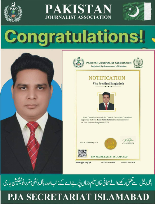 বিশেষ প্রতিনিধি : বিশ্বের বিভিন্ন দেশের পেশাদার সাংবাদিকদের সমন্বয়ে গঠিত আন্তর্জাতিক সংগঠন Pakistan Journalist Association (PJA)–এর কেন্দ্রীয় কমিটির সদস্য এবং বাংলাদেশ শাখার সহ-সভাপতি হিসেবে নির্বাচিত হয়েছেন Bangladesh Central Press Club (B.C.P.C)–এর প্রতিষ্ঠাতা সভাপতি ও জাতীয় দৈনিক মাতৃজগত পত্রিকার সম্পাদক খান সেলিম রহমান।আন্তর্জাতিক অঙ্গনে সাংবাদিকতার ক্ষেত্রে তাঁর এই গুরুত্বপূর্ণ অর্জনকে গণমাধ্যম সংশ্লিষ্টরা একটি ইতিবাচক ও সম্মানজনক মাইলফলক হিসেবে দেখছেন। সাংবাদিকতা পেশায় দীর্ঘদিনের অভিজ্ঞতা, সংগঠক হিসেবে দক্ষতা এবং নিরপেক্ষ ও বস্তুনিষ্ঠ সাংবাদিকতার প্রতি তাঁর অবিচল অবস্থানের স্বীকৃতিস্বরূপ এই দায়িত্ব প্রদান করা হয়েছে বলে মনে করছেন সংশ্লিষ্ট মহল।সোমবার (৫ জানুয়ারি) পাকিস্তান জার্নালিস্ট অ্যাসোসিয়েশনের অফিসিয়াল ফেসবুক পেজ ও এক প্রেস বিজ্ঞপ্তির মাধ্যমে খান সেলিম রহমানকে আনুষ্ঠানিকভাবে অভিনন্দন জানানো হয়। বিজ্ঞপ্তিতে তাঁর পেশাগত অবদান, নেতৃত্বের গুণাবলি এবং আন্তর্জাতিক সাংবাদিকতার ক্ষেত্রে ভূমিকার ভূয়সী প্রশংসা করা হয়।